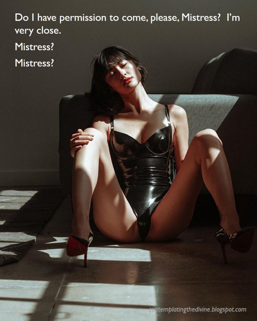 Dommes say the funniest things. One beautiful lady once tied me to the bed and giggled sexily in my ear about how much she’d like to take my cock in her mouth and nibble it gently before taking firm hold with her hand and pumping… pumping… The silly thing must have forgotten she’d locked me in a tight chastity restrainer! But I didn’t say anything to embarass her.