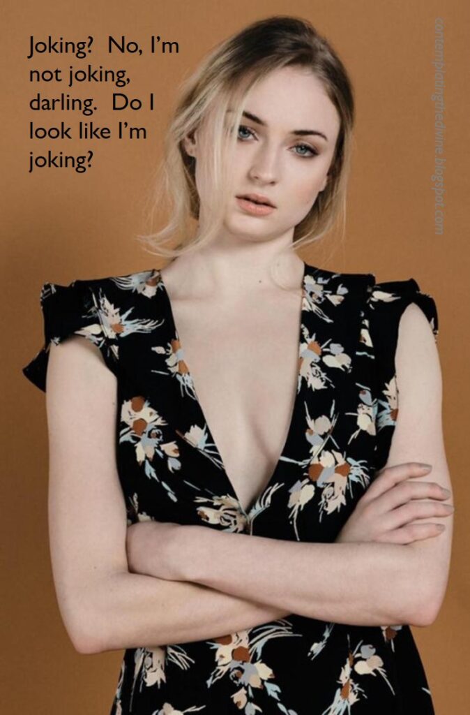 It’s not a rhetorical question, as so many questions in the captions here are. The delightfully unsmiling Ms Venten does genuinely want to know what you think, so she can decide whether your opinions as well as your behaviour need to be sorted out.