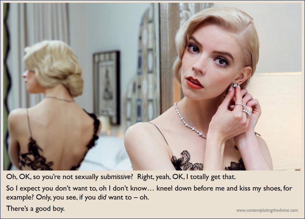 It’s the latest in an occasional series celebrating the thrill and beauty of non-consensual femdom. Do I need to explain that this is intended to be tongue-in-cheek? I probably do, because most of you are male and thus a bit dim, even when you’re not wanking. In reality, consent is obviously of utmost importance in our weird little corner of the Internet. Any male speaking, acting or holding back money without his domme’s active and conscious permission to do so, is doing femdom wrong.