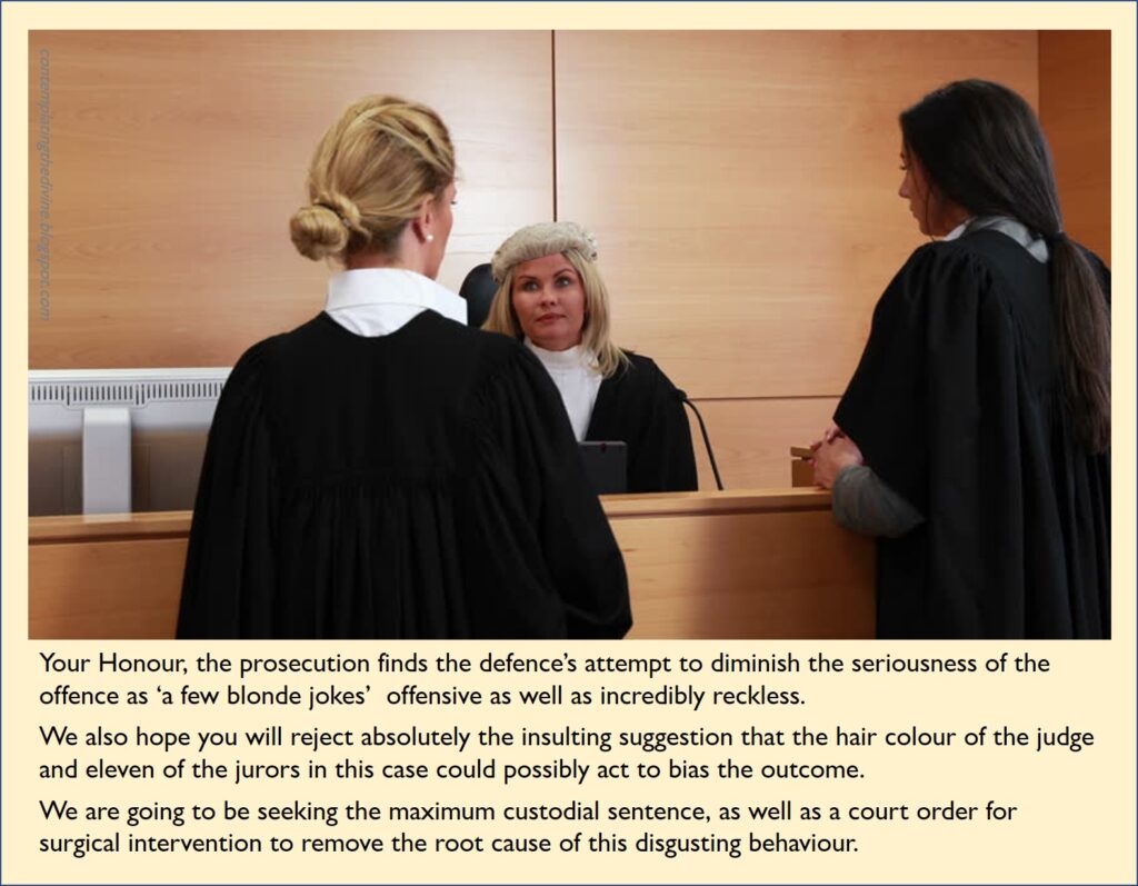 How many blondes does it take to change a sexist’s entire outlook on life? Just one, as long as she’s got a whip and he’s got an indefinite sentence. But actually, there are over 10,000 blonde officers in the Male Rehabilitation Service, and more than enough whips to go round, so it doesn’t really work like that in practice.