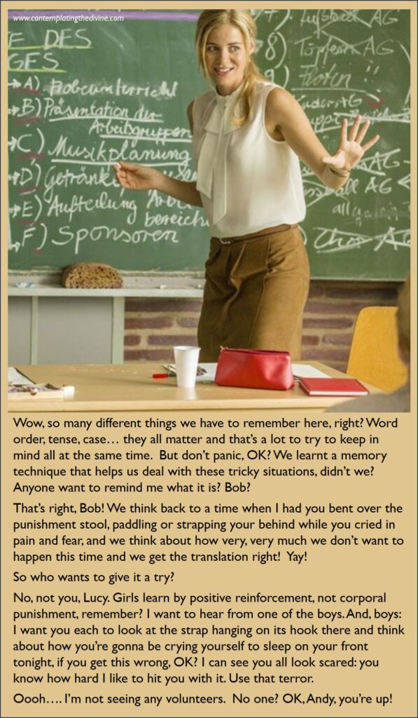Incidentally, my captions here often feature the wonderful Mistress Eleise (with whom I had the pleasure and pain in Paris of a session or three) objecting to blonde jokes. But that’s just my invention. Maybe she really likes them, collects them and treasures examples in which the blonde is being particularly dumb? If anyone visits Canada and if she’s still working, do try a few out and let us know how it goes.