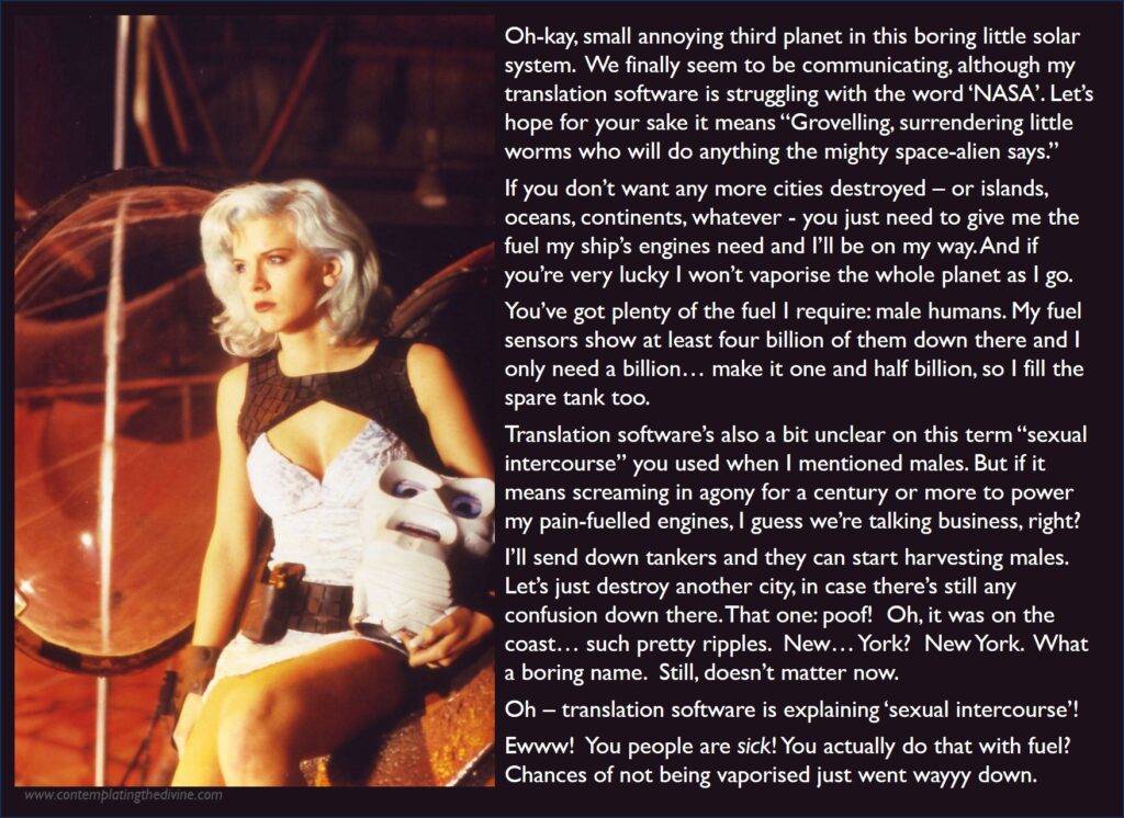 You know, if asked to choose the greatest TV science fiction goddess, I would be torn between Cylon Number 6, with her ethereal cold beauty and razor sharp machine mind, able to unleash fleets of killer robots, and Zev, part (liberated) sex slave, part savage cluster lizard, here seen in command of the greatest weapon of destruction in the two universes. Not that I’d get to decide you understand… but just being torn between the two of them would be honour enough for one brief agonising moment.