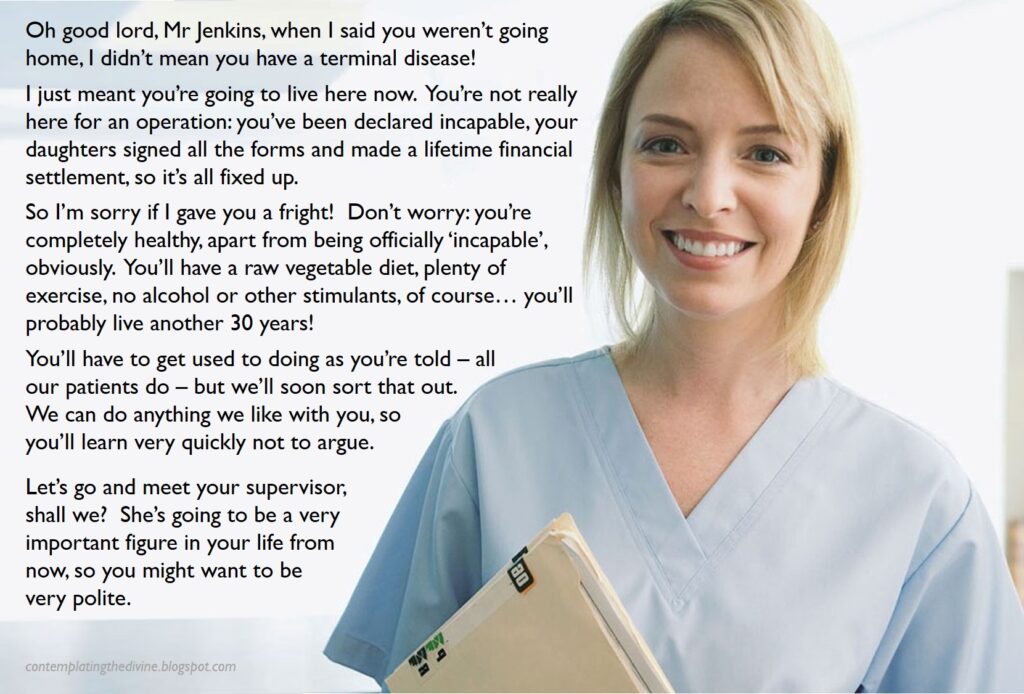 The healthy diet might lead to a long life, but he might perhaps want to remember, when dealing with the supervisor or other ‘carers’, that the longer his life goes on, the worse a deal the one-off financial settlement ends up being for the institution. But I’m sure they’ll do the right thing, whatever they decide that to be. Anyway, it’s very reasonable as the food and heating bills are remarkably low, leaving his loving daughters plenty of money to spend however they like, secure in the knowledge that he is being properly looked after.