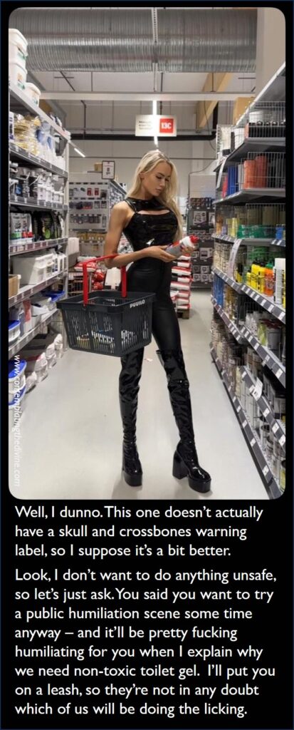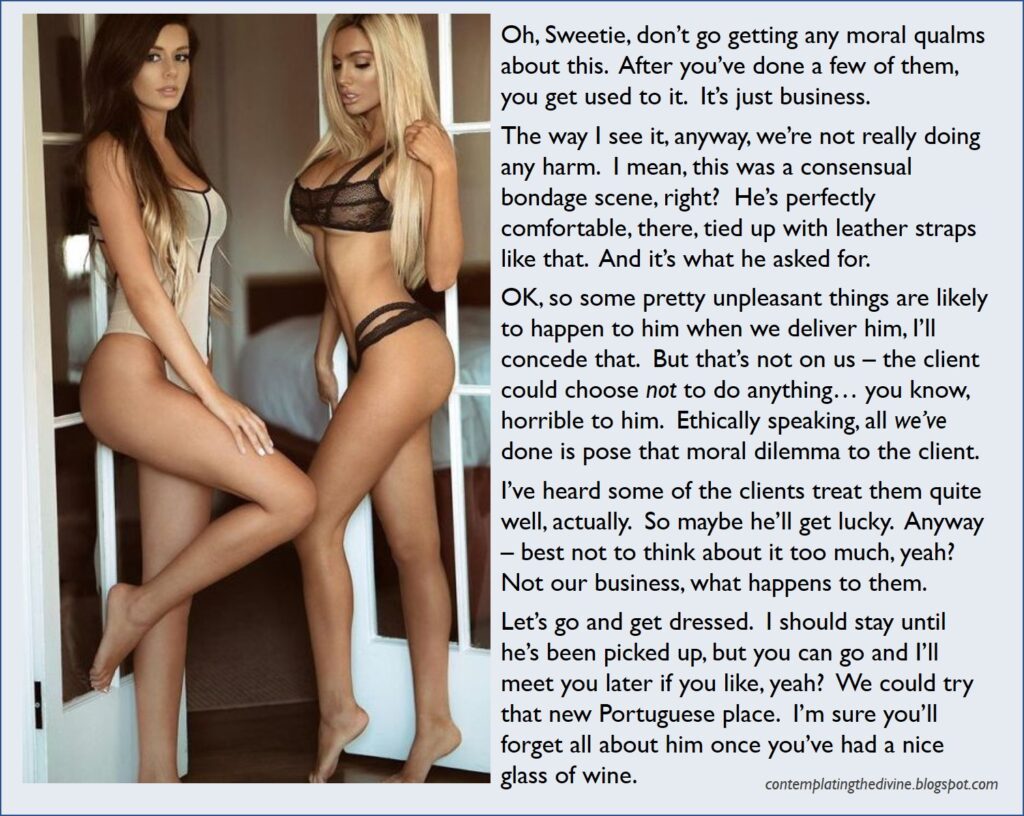 Stories and pictures themed around female domination and male subjugation and servitude. Unsuitable for children, for alpha males, for hard-core practitioners with an interest in the politics of bdsm and the mechanics of complicated rope work. Of interest to perverts like me, basically.