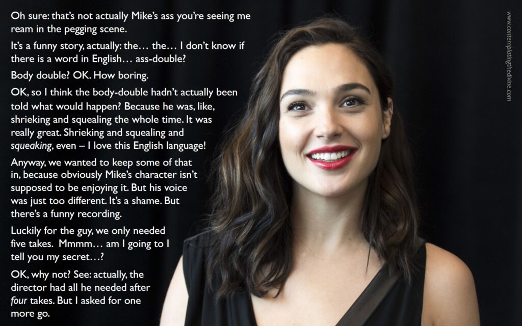 Her command of the English language isn’t perfect but she’s somehow picked up the words ‘reaming’ and ‘pegging’ on the way, showing impressive commitment.