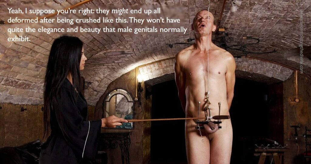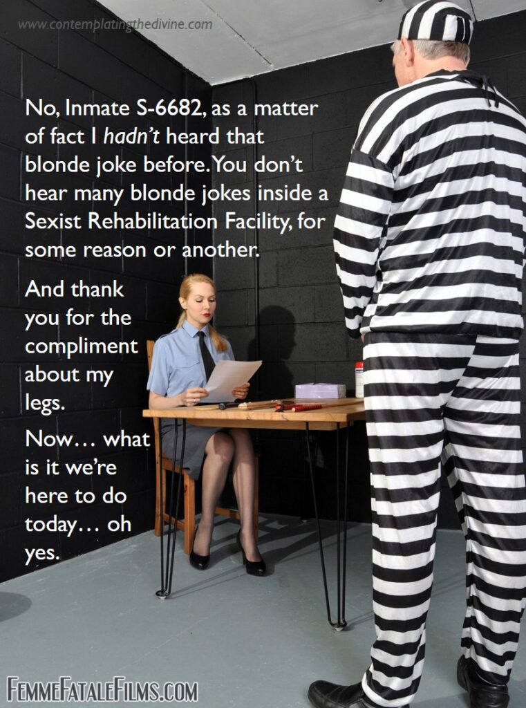 Incidentally, my captions here often feature the wonderful Mistress Eleise (with whom I had the pleasure and pain in Paris of a session or three) objecting to blonde jokes. But that’s just my invention. Maybe she really likes them, collects them and treasures examples in which the blonde is being particularly dumb? If anyone visits Canada and if she’s still working, do try a few out and let us know how it goes.