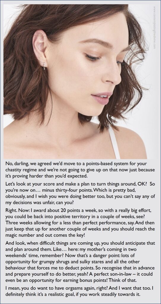 On Tuesday I’m due to go and see a lady I’ve not had a session with before and we’ve agreed on email that it’ll be a domestic scene in which she scolds me, is demanding and impossible to please and generally thoroughly unreasonable. Which sounds lovely, but what if she changes her mind and just decides to do something else on a whim?