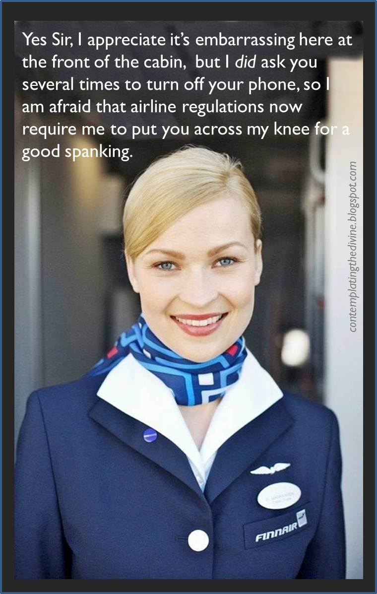 Once again, on behalf of Air Divine I hope our female passengers enjoy the flight, and that our male passengers do not. If there is anything at all that can be done to make your flight more enjoyable, or your slave’s flight less so, please let me or my cabin staff know and we will endeavour to assist. We know that our female customers have a choice of airline, and we appreciate your continued custom aboard Air Divine. Finally, may I draw your attention to our frequent flyers programme? Frequent flyers with Air Divine can receive a wide range of awards, from free samples of our exclusive range of Air Divine crops to perfumes, fine wines and jewellery. As an additional incentive, new recruits to the programme will receive a free slave. Membership is free, so please sign up today and pick up your free slave from the customer help desk on arrival.