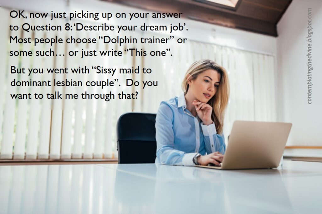 Self-explanatory, I thought. She should move on to the “What do you consider your greatest weaknesses or failings?” question, as there’s about six pages in response to that one.