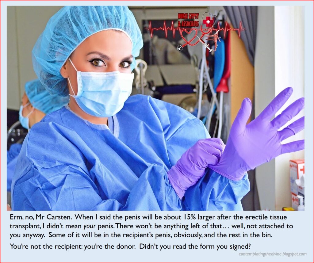 Later on, she’s going to perform a procedure in which she’ll carefully pull a thin strip of flesh away from your thigh, then reattach it in exactly the same place. There’s no therapeutic benefit, but she enjoys it.