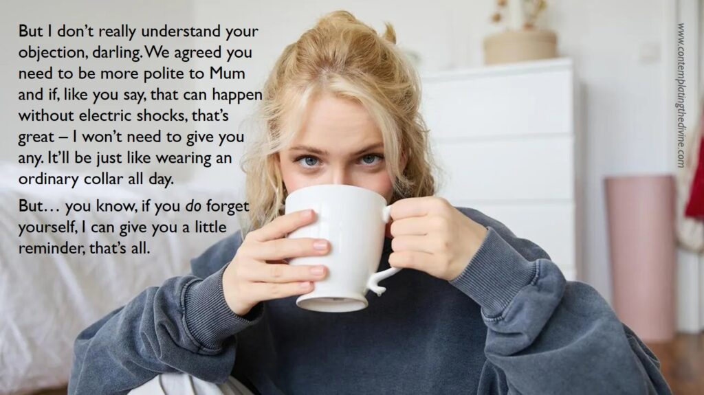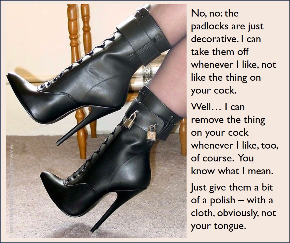 Dommes say the funniest things. One beautiful lady once tied me to the bed and giggled sexily in my ear about how much she’d like to take my cock in her mouth and nibble it gently before taking firm hold with her hand and pumping… pumping… The silly thing must have forgotten she’d locked me in a tight chastity restrainer! But I didn’t say anything to embarass her.