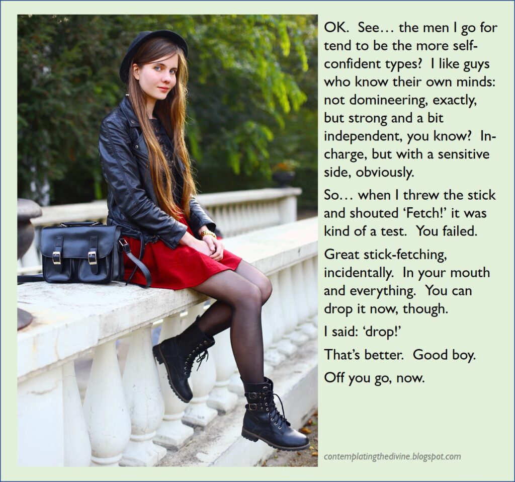 “I wrote a book once trying to explain Female Supremacism to males. It’s actually quite an interesting challenge, to dumb down Femsupremacist thinking into concepts their simple brains can understand. Of course, my favourite boy helped. I’d read a passage and test his understanding. If he didn’t follow my first draft, I’d resist the temptation to whip him for stupidity (OK, I didn’t always resist), grit my teeth and go and try again. I wanted to call it Listen, you fucking morons! but the publisher persuaded me to go with Learning to be nurtured.”
