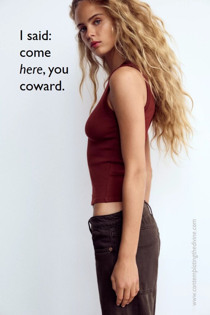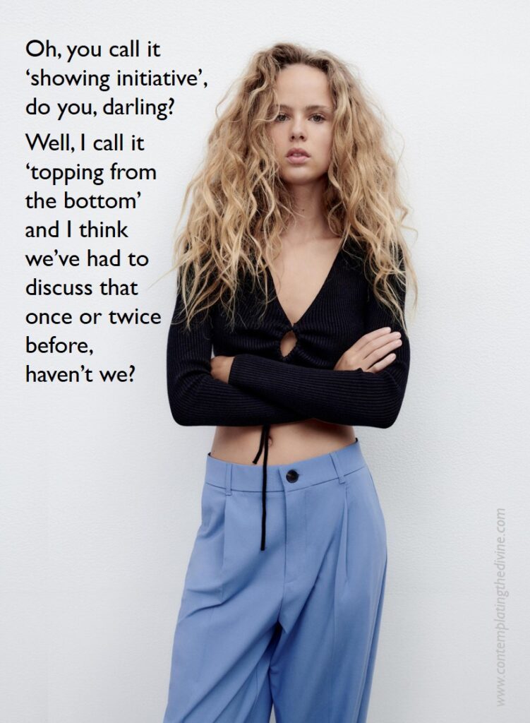 Rather a narrow focus to today’s ‘special’ (you have noticed that Sunday’s posts are always specials, right? Course you have). Anyway, this is just to celebrate my discovery of a lovely young lady fashion model called Olivia Vinten. Unlike many other models, Ms Vinten does not seem to believe in smiling for the camera, preferring instead a pursed-lips look that to my mind expresses contempt, outrage or even barely repressed fury. All of these are delightful emotions for females to hold – entirely understandably when confronted by the exasperating and incompetent lesser sex – so she is today’s celebrated goddess and will feature again in future. She looks so cross… and regular ‘readers’ will know I have a soft and tender spot for women looking cross.