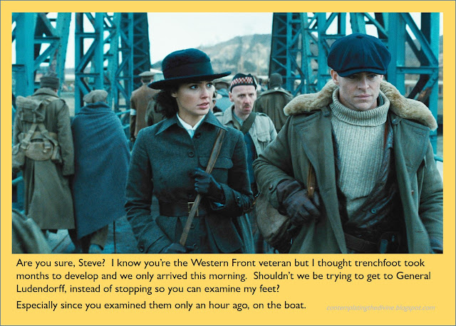 But one of the themes of the plot, that I think works pretty well, is the tension between Steve and Diana as their mission progresses. Sure, they’re both on the track of General Ludendorff, but they don’t share exactly the same objectives and that tension comes to the surface sometimes, as Steve tries to get Diana to do things his way. Good luck with that, boy – Amazon princess, remember? Anyway, those interactions are some of my favourite human moments in the movie, so I’ve tried to get the dialogue down to the best of my ability and put them into a few captions.